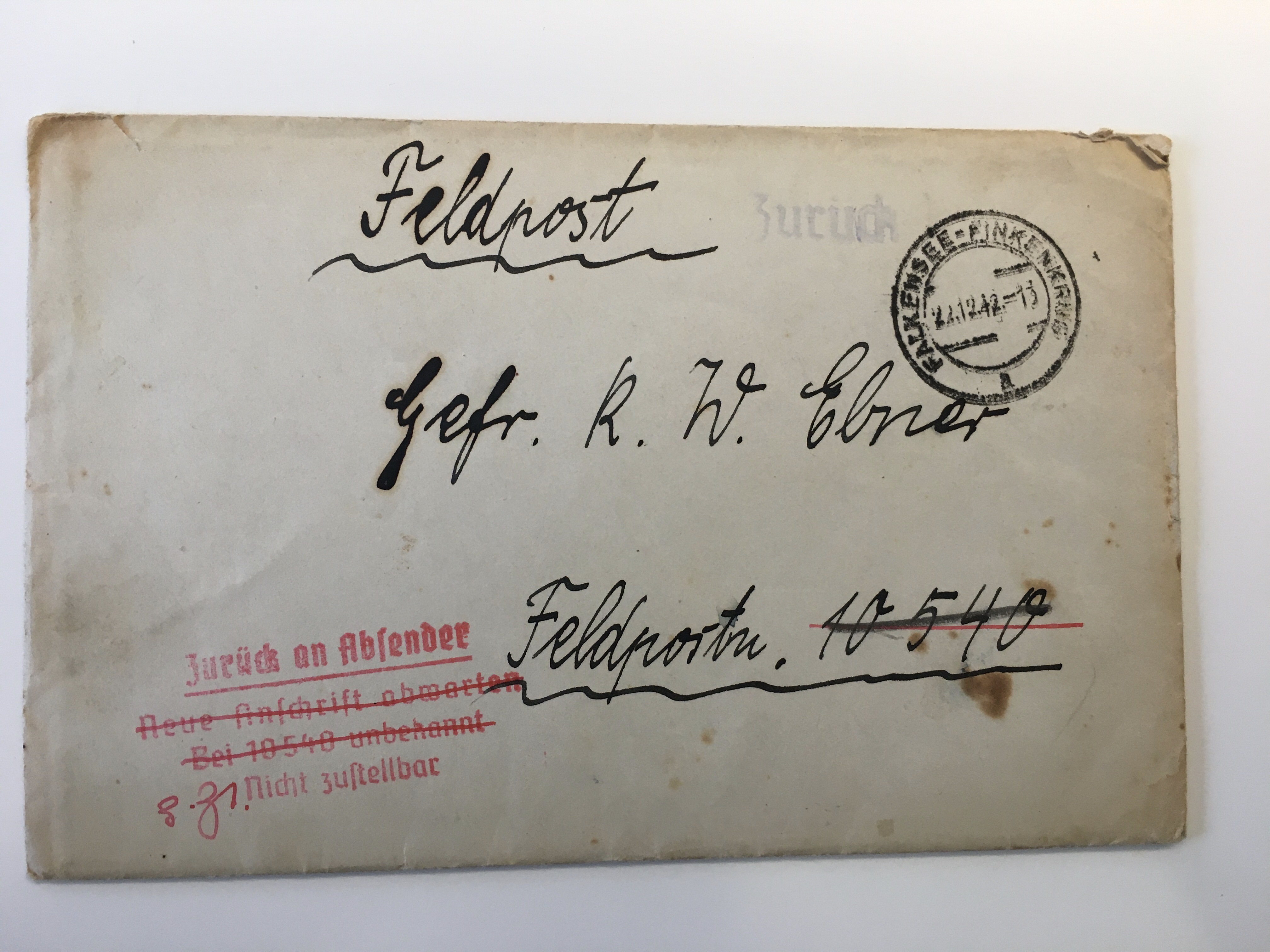 Wie von den anderen schon geschrieben, hat die Einheit den Brief zurückgeschickt. Leider ohne Datumsvermerk. Also war er sehr wahrscheinlich im Kessel.